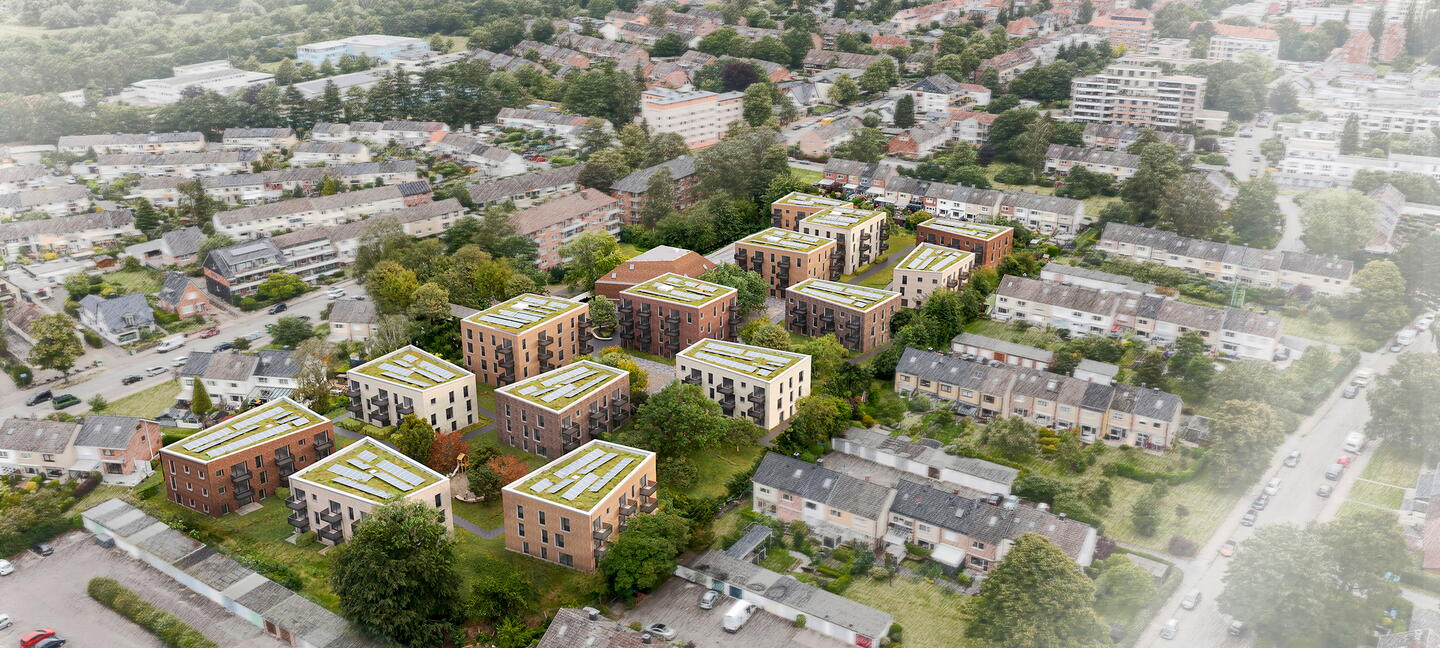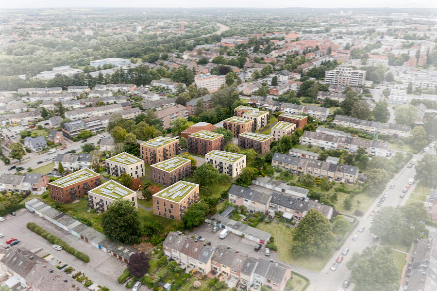 Sämtliche Gebäude erhalten extensiv begrünte Dachflächen mit integrierten Photovoltaikanlagen